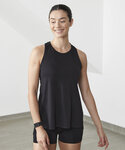 Soft-touch single Jersey fabric. Self-fabric binding at neck and armholes. Wide racer back with forward facing shoulder seams. Long back with split up the middle, which can be worn open or tied up. Curved back section where split begins. Tombo tear-out label.